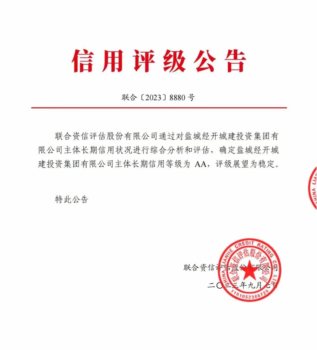 9月7日,經(jīng)國內(nèi)權威評級機構聯(lián)合資信評估股份有限公司(簡稱“聯(lián)合資信”)綜合分析評定,鹽城經(jīng)開城投集團成功獲評AA主體信用評級,評級展望為“穩(wěn)定”。
