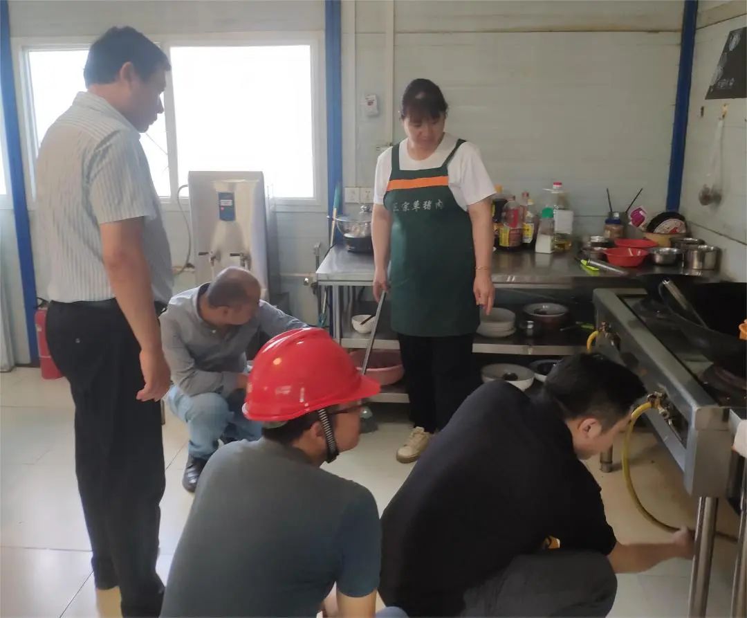 此次檢查行動(dòng),重點(diǎn)排查了項(xiàng)目工地液化氣鋼瓶是否存在占?jí)?、漏氣、銹蝕,灶具連接軟管是否存在老化、開裂、漏氣、接口松動(dòng),燃?xì)庠罹呤欠衽c氣源相匹配、超期使用,已安裝的可燃?xì)怏w報(bào)警裝置是否能正常使用等問題,同時(shí)多角度、全方位向食堂工作人員講解燃?xì)獍踩R(shí),提醒定期對液化氣瓶的連接軟管、灶具開關(guān)、減壓閥等進(jìn)行檢查,全面提升工作人員的燃?xì)獍踩庾R(shí)及異常情況應(yīng)變處置能力。