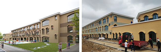 步鳳鎮(zhèn)中心幼兒園改造項(xiàng)目效果圖(左)與現(xiàn)場(chǎng)圖(右)
