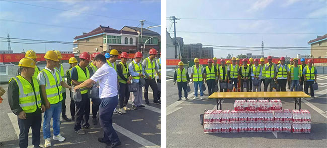 項(xiàng)目現(xiàn)場,張志軍詳細(xì)了解了項(xiàng)目作息時(shí)間、現(xiàn)場防暑降溫物資配備、高溫作業(yè)防護(hù)和安全生產(chǎn)措施等情況,并為每位施工人員分發(fā)了豐富的“清涼禮包”,包括礦泉水、藿香正氣水、人丹等一系列防暑降溫物品,承載著對(duì)工人健康與安全的深切關(guān)懷。他強(qiáng)調(diào),當(dāng)下正值高溫酷暑時(shí)期,各項(xiàng)目部要統(tǒng)籌做好各項(xiàng)安全生產(chǎn)工作,重點(diǎn)抓好高溫天氣的防暑降溫、安全防護(hù)措施和應(yīng)急處置等工作,合理安排作業(yè)時(shí)間,切實(shí)維護(hù)施工人員的職業(yè)安全和健康。